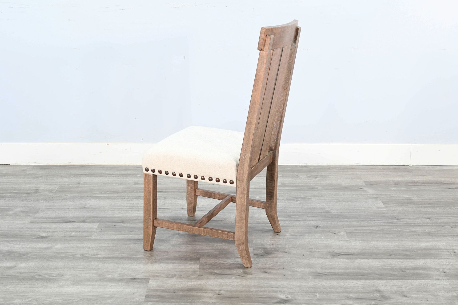 This Vivian slat-back chair with cushion seat is beautifully traditional and elegant. Built with rough sawn mahogany solids and veneer.