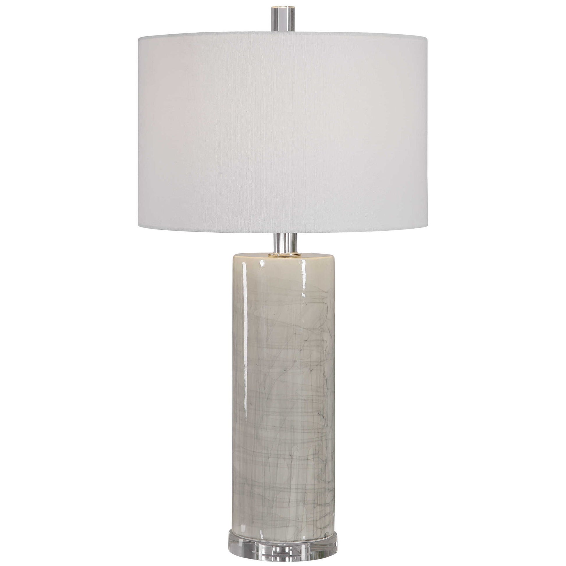 Modern In Design, This Ceramic Table Lamp Showcases A Neutral Beige Glaze With An Abstract Gray Drip Pattern, Paired With Elegant Crystal Details And Polished Nickel Plated Accents. The Hardback Drum Shade Is A White Linen Fabric.